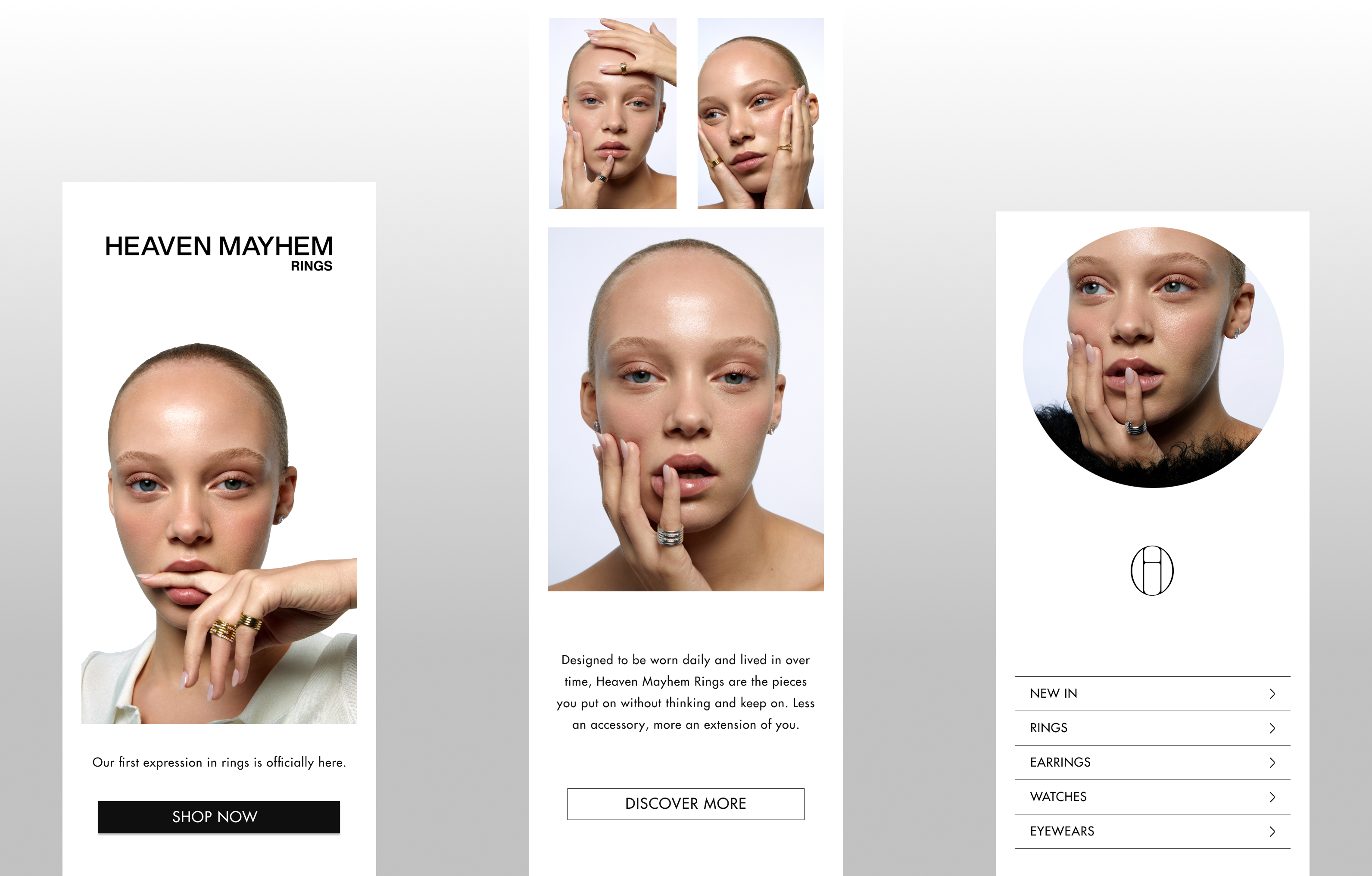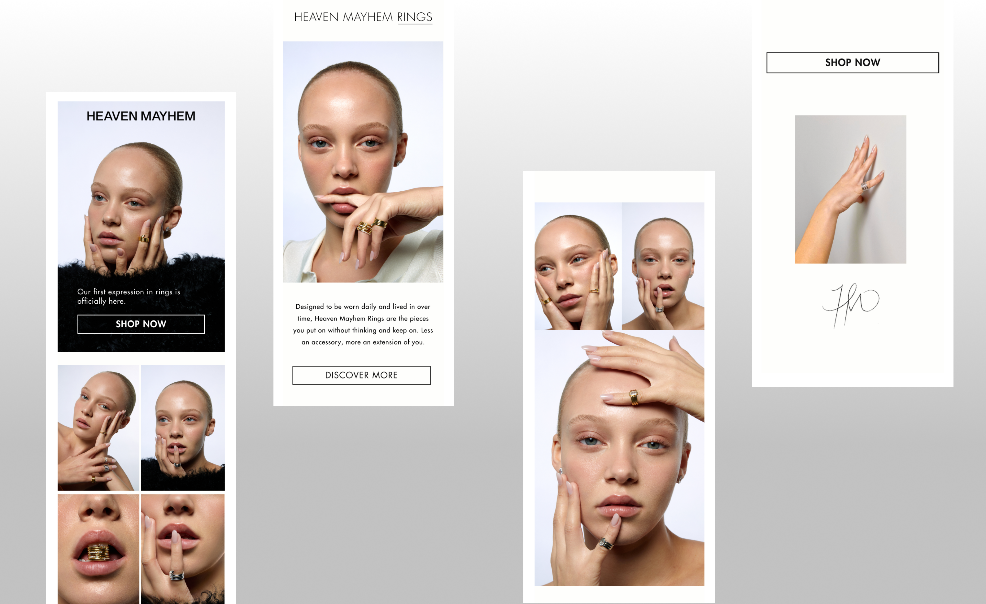 Heaven Mayhem’s email and SMS campaign for the ring collection was designed to highlight each piece through a clean, elevated, and product-focused approach.